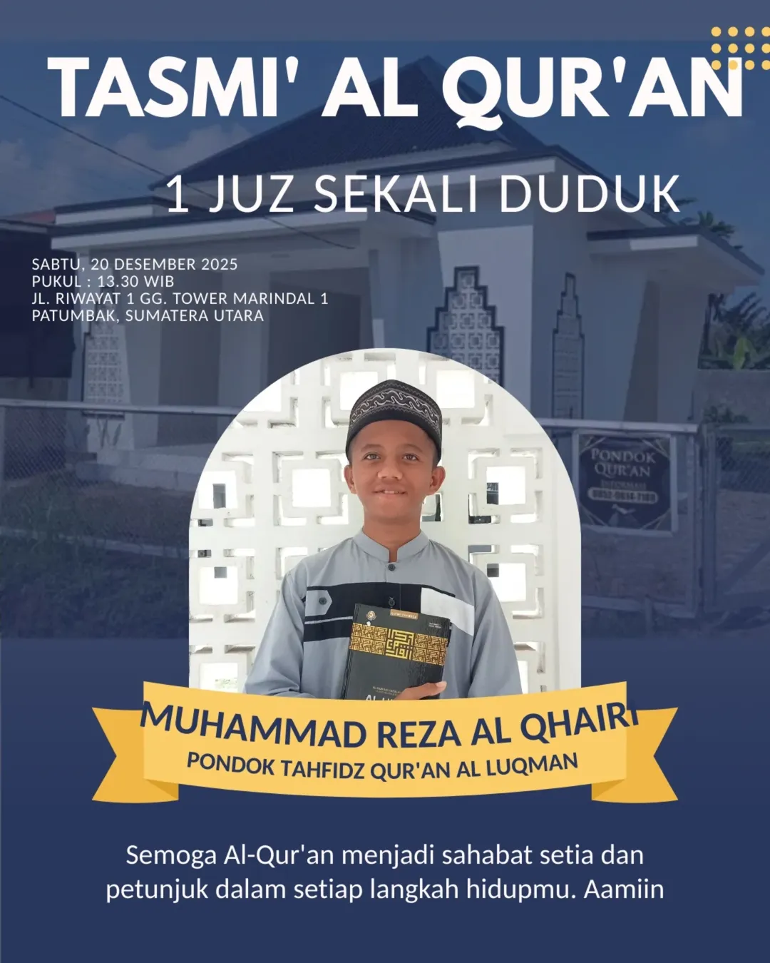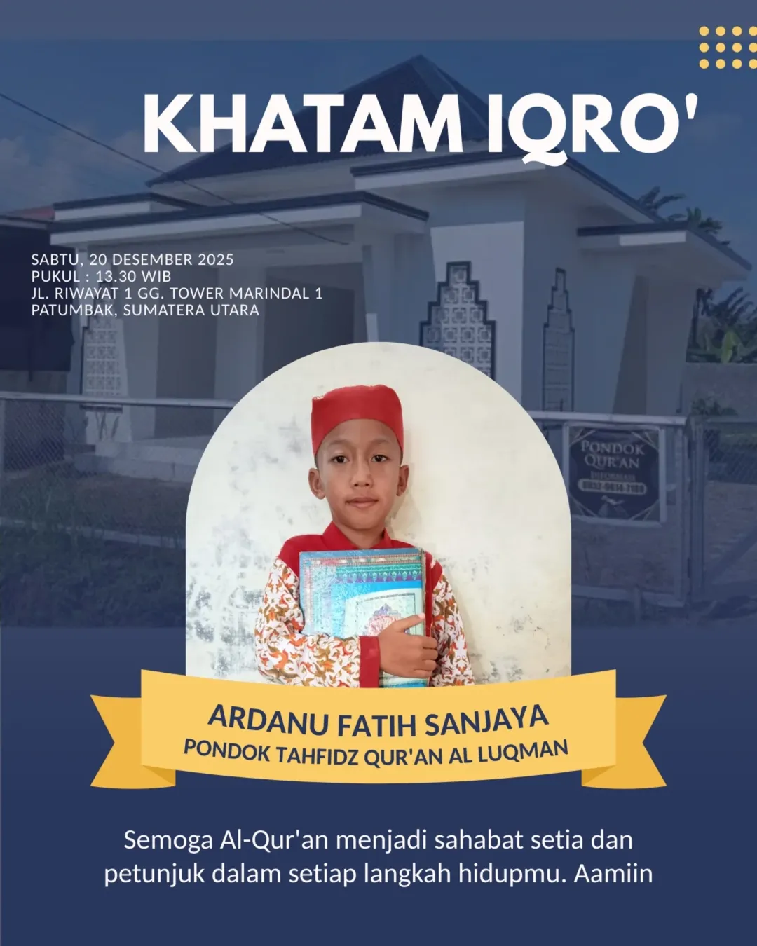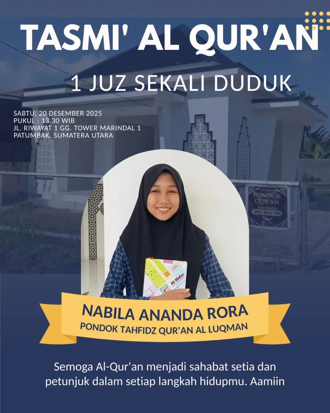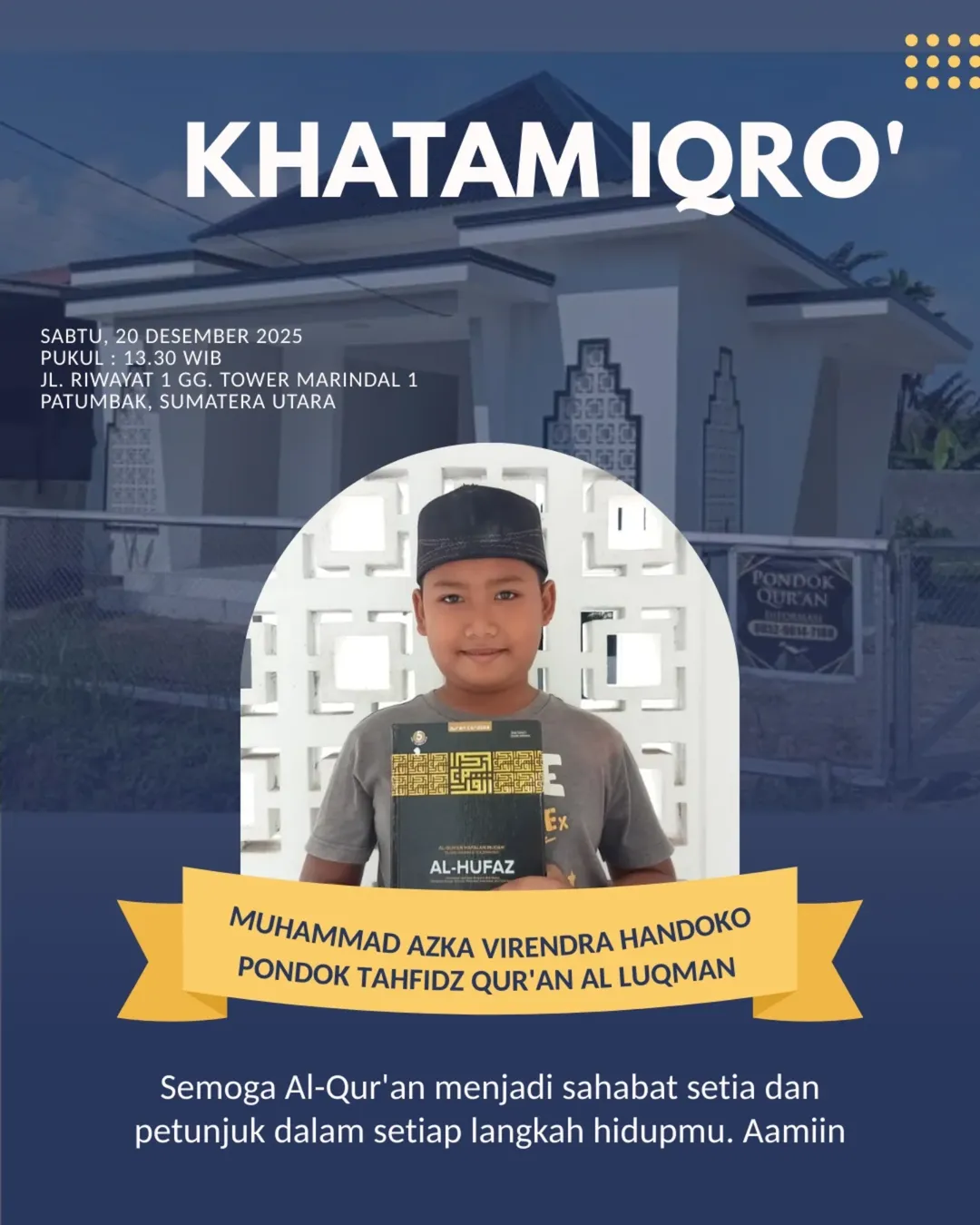 Daftar SekarangTentang Pondok Tahfidz Qur’an Al Luqman Mencetak Generasi Qur’ani Berakhlak Mulia Pondok Qur’an Al Luqman merupakan lembaga pendidikan Al-Qur’an yang berada di bawah naungan Yayasan Chalisaturrahmi Luqman Halim. Perjalanan pondok ini dimulai pada tahun 2016, berawal dari sebuah garasi rumah dengan penuh kesederhanaan namun sarat dengan semangat dakwah dan pendidikan Islam. Dalam proses perjalanannya, kegiatan pembelajaran Al-Qur’an sempat berpindah lokasi beberapa kali. Hal tersebut tidak menyurutkan tekad para pengurus dan pengajar untuk terus menghadirkan pendidikan Al-Qur’an yang istiqamah dan berkualitas. Atas izin Allah SWT, pada tahun 2023, seorang hamba Allah mewakafkan sebidang tanah seluas ±20x20 meter persegi. Dengan dukungan para donatur dan kaum muslimin, tanah wakaf tersebut kemudian dibangun hingga akhirnya Pondok Qur’an Al Luqman resmi berdiri dan mulai beroperasi pada Februari 2025. Hingga saat ini, Pondok Qur’an Al Luqman membina santri, yang terbagi ke dalam beberapa kelas sesuai dengan tingkat kemampuan dan tahapan pembelajaran masing-masing. Fokus utama pembelajaran adalah tahsin, tahfidz, serta pembinaan akhlak Islami agar para santri tidak hanya mampu menghafal Al-Qur’an, tetapi juga mengamalkannya dalam kehidupan sehari-hari. Dengan lingkungan yang kondusif, asatidz yang amanah, serta dukungan dari para donatur dan masyarakat, Pondok Qur’an Al Luqman terus berkomitmen menjadi wadah pendidikan Qur’ani yang melahirkan generasi beriman, berilmu, dan berakhlak mulia.